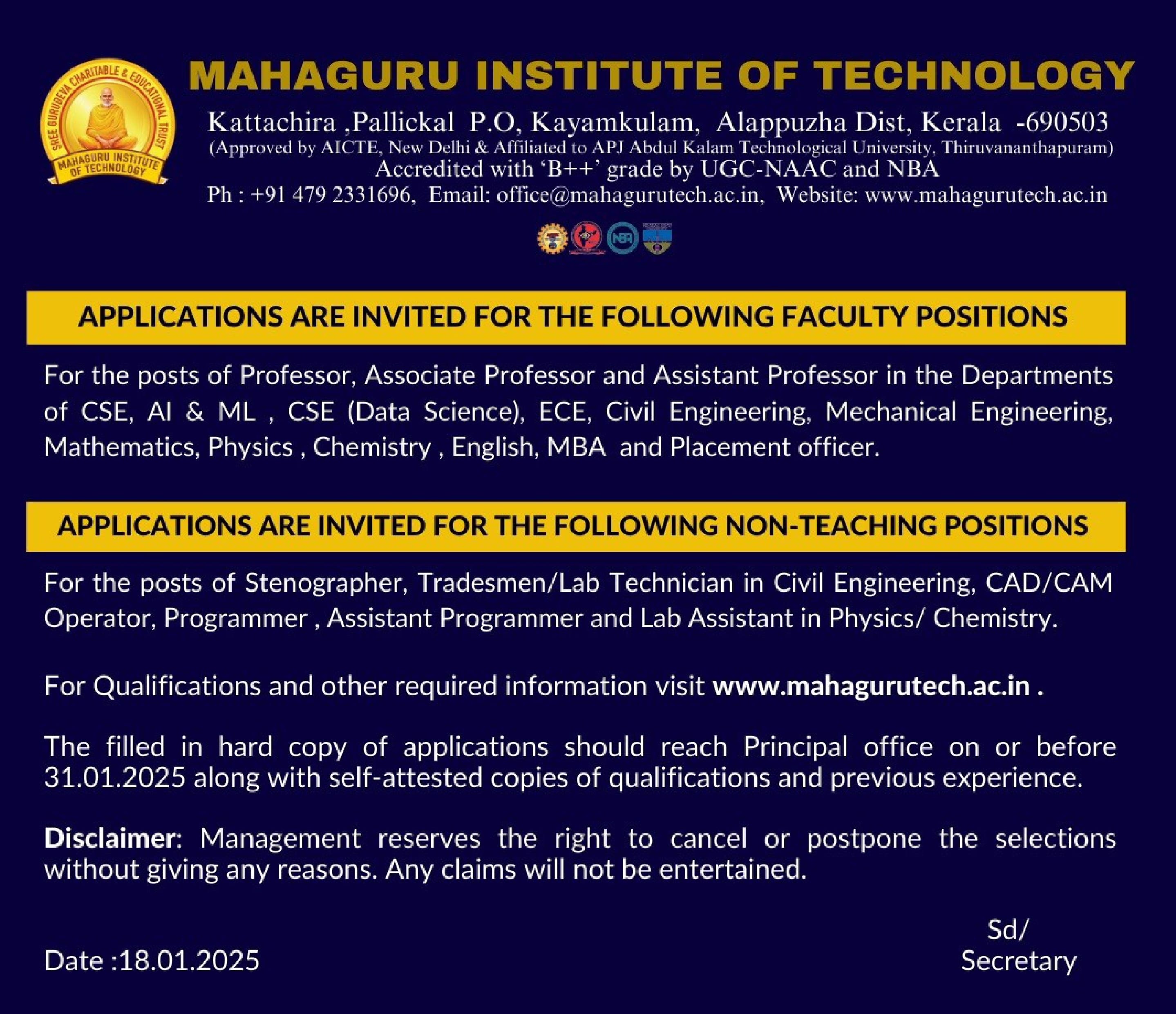 Applications are invited for the posts of Professors, Associate Professors, Assistant Professors in the Departments of AI&ML, CSE, CSE (Data Science), ECE, Civil Engineering, Mechanical Engineering, Mathematics, Physics, Chemistry, English, MBA and Placement Officer.