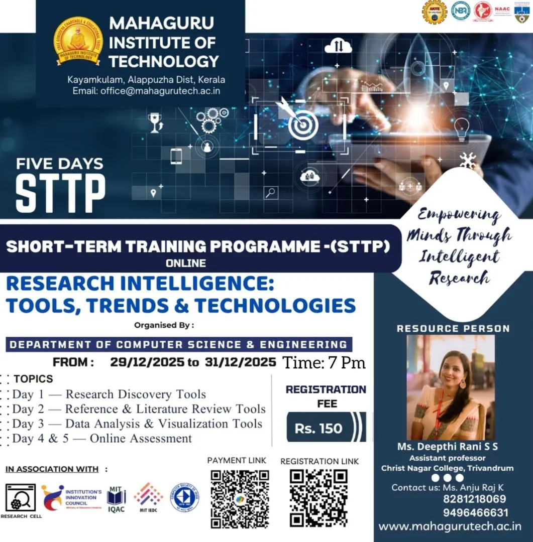 MIT is organizing a five-day online STTP on “Research Intelligence: Tools, Trends & Technologies,” covering research discovery, literature review, data analysis, and assessment tools for advanced research skills.