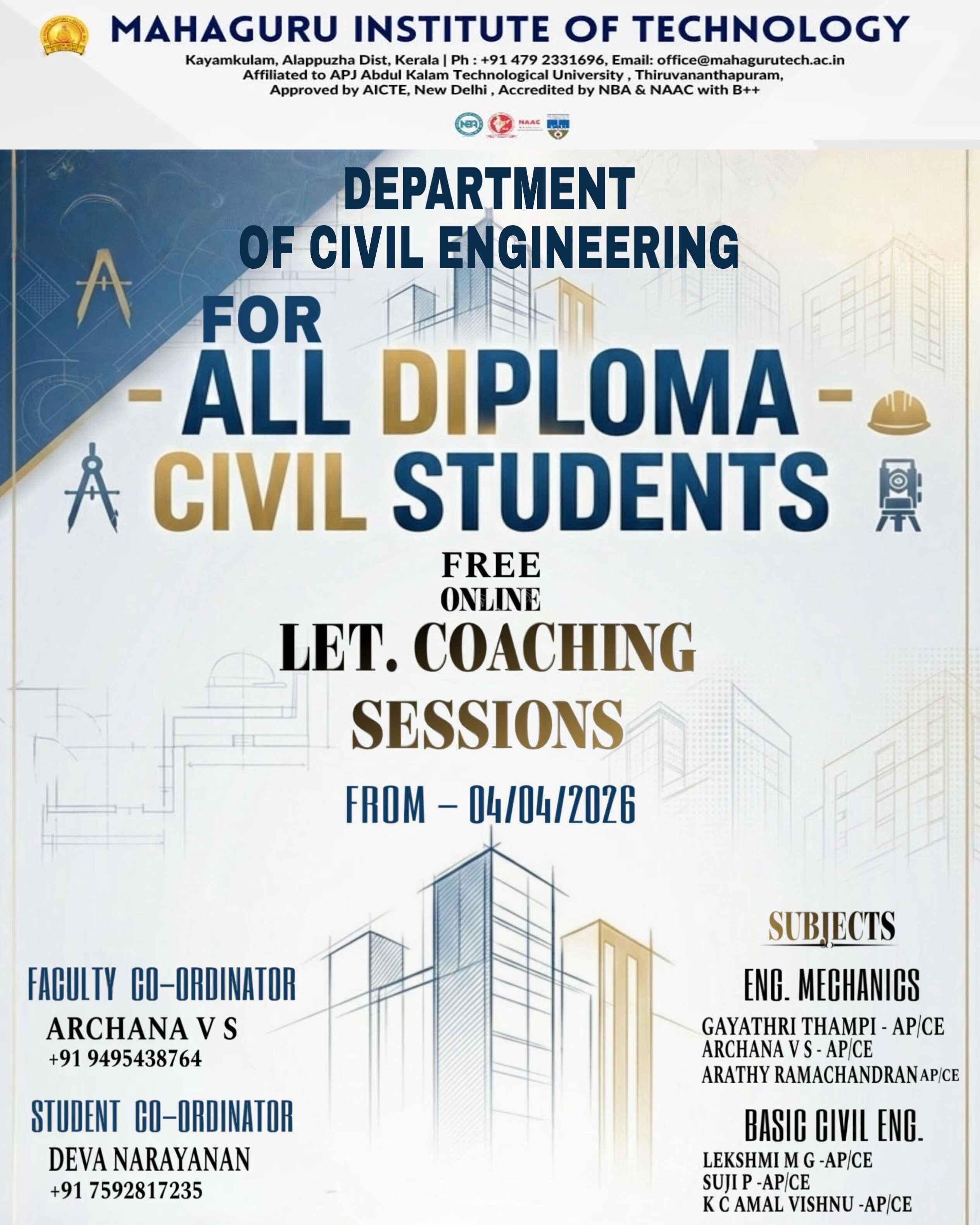 MIT is offering free online LET coaching sessions for diploma students. Benefit from expert-led classes to prepare for the Kerala B.Tech Lateral Entry Test & secure direct admission to the 3rd semester.