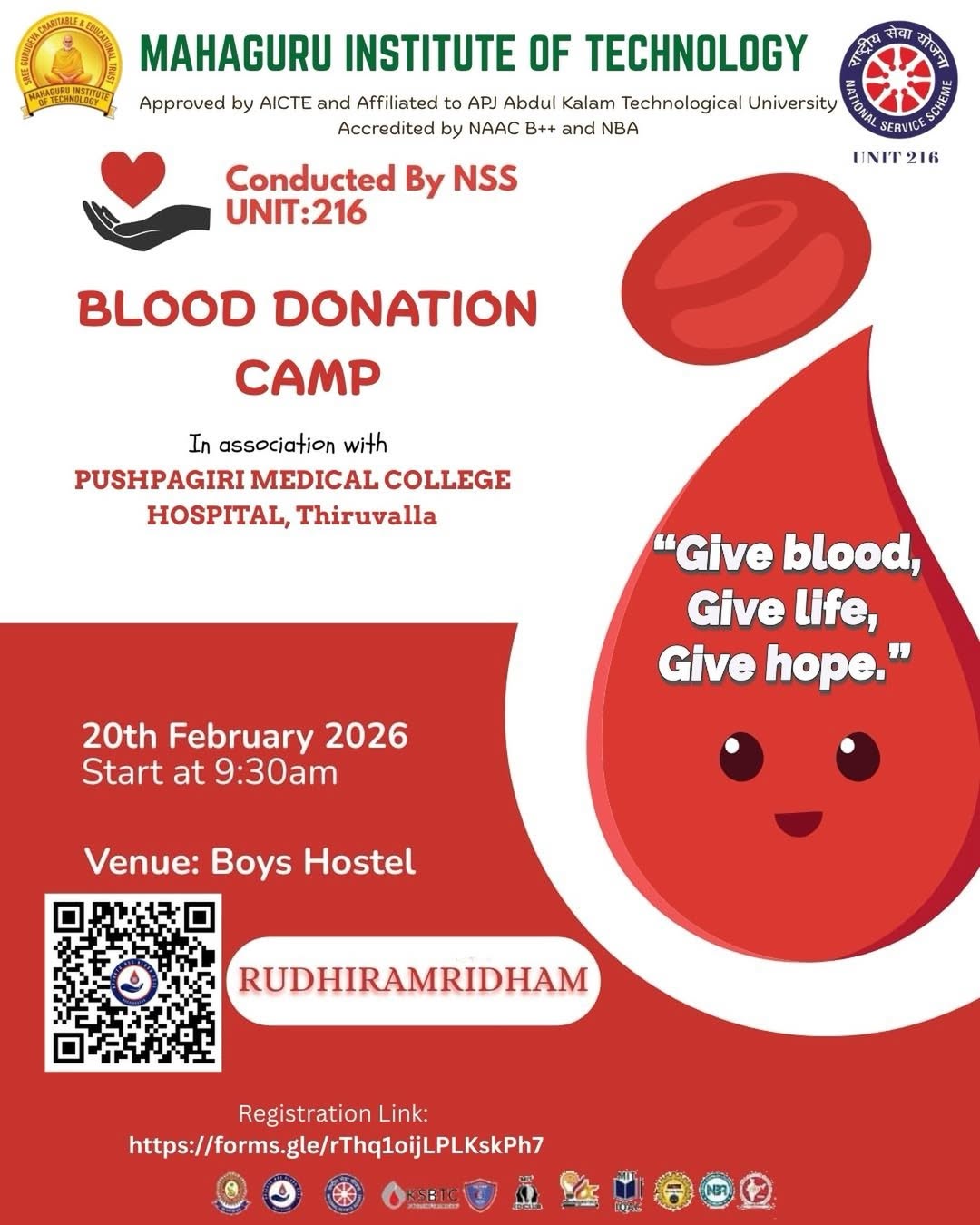 A Blood Donation Camp titled "Rudhiramridham" was organized on 29th July 2025 by NSS Unit-216. The event emphasized the noble act of saving lives through blood donation and welcomed registrations through a QR code.