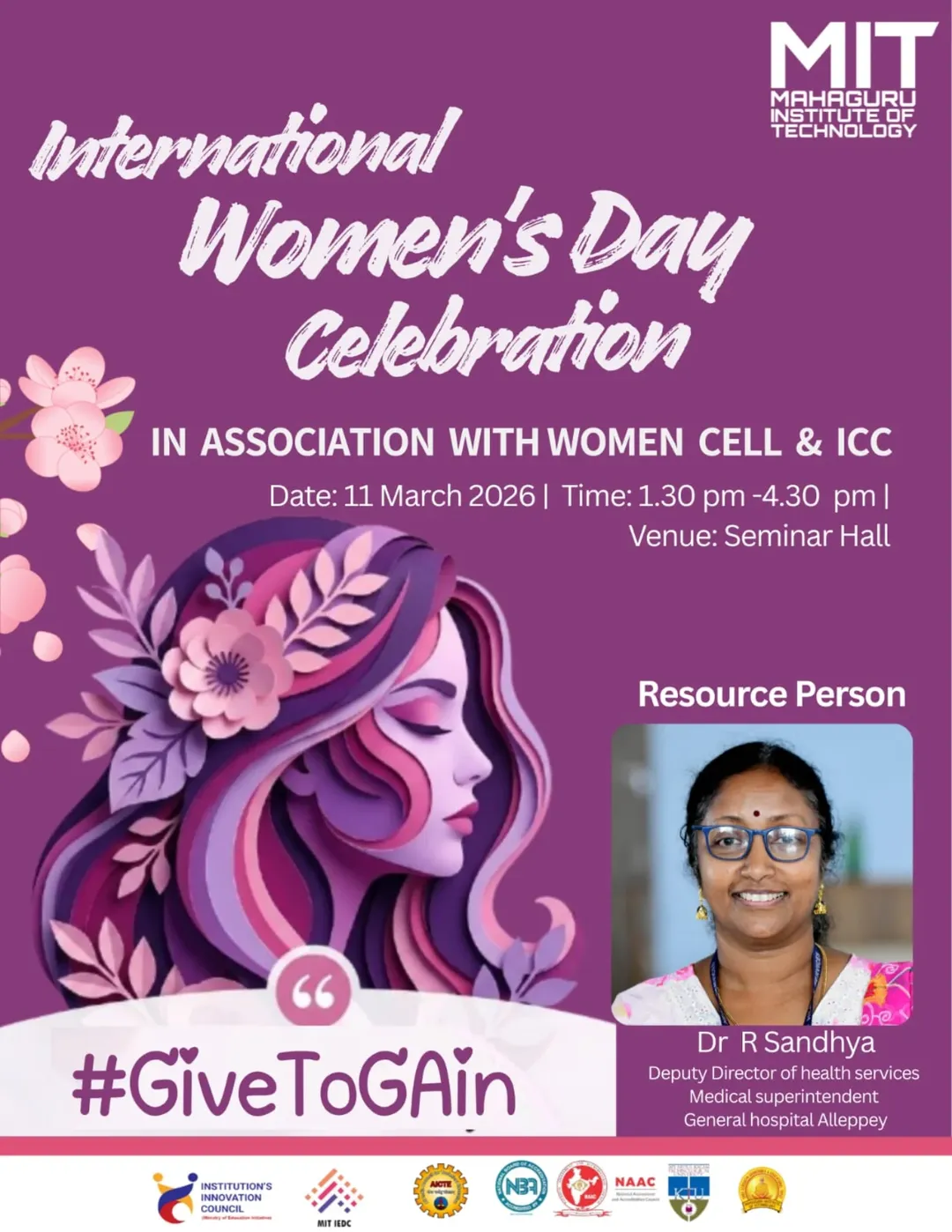MIT is celebrating International Women’s Day in association with the Women Cell and ICC. The event honors the achievements and contributions of women, inspiring the community to #GiveToGain and promote empowerment and equality.