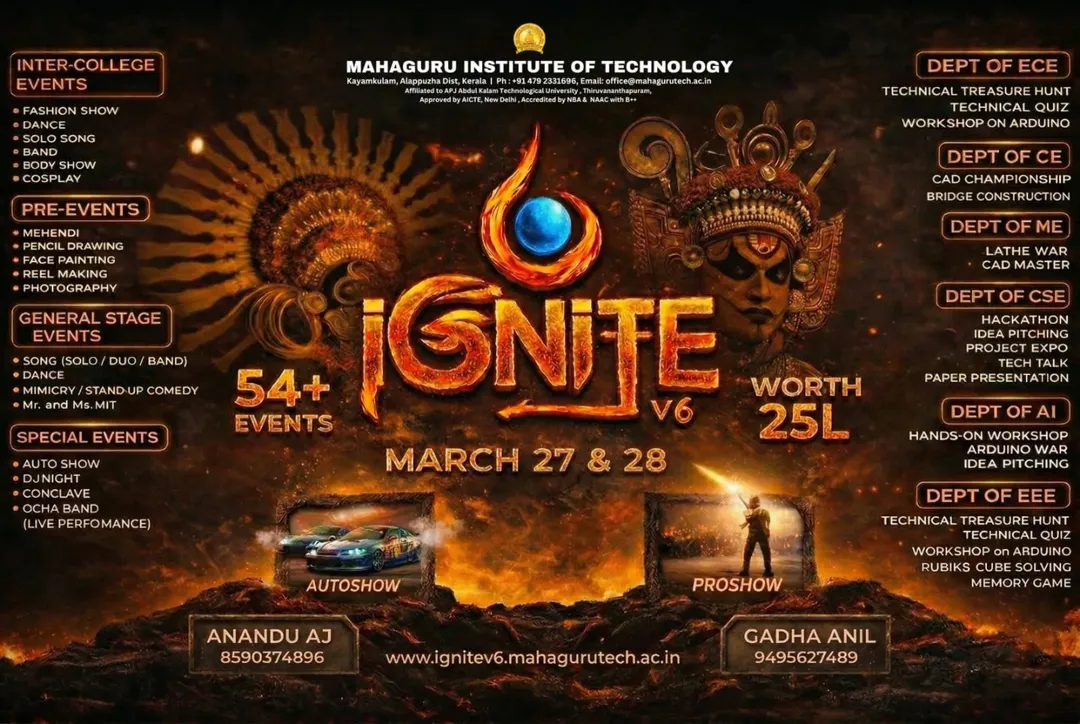 IGNITE V6 is the ultimate techno-cultural fest at MIT, featuring 54+ exciting events including inter-college competitions, technical challenges, cultural performances, and special shows. Join us for two days of innovation, creativity, and celebration!