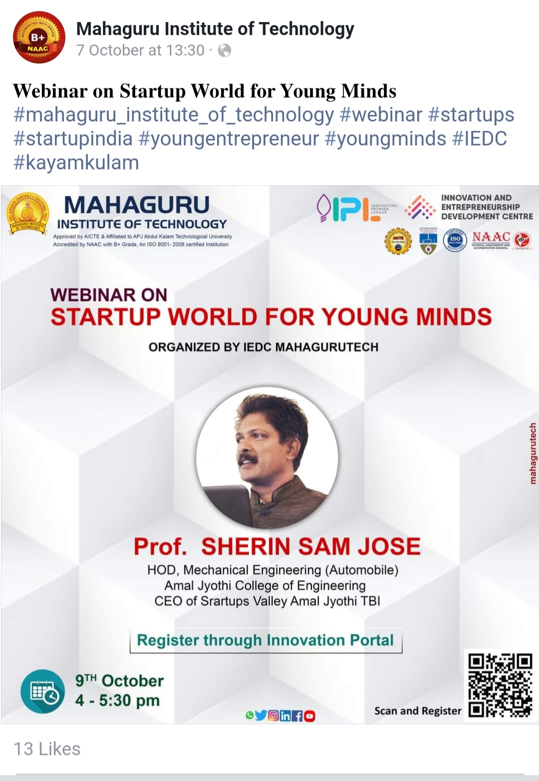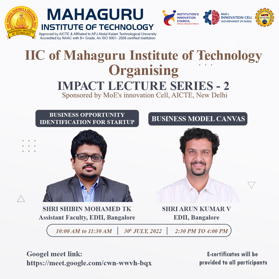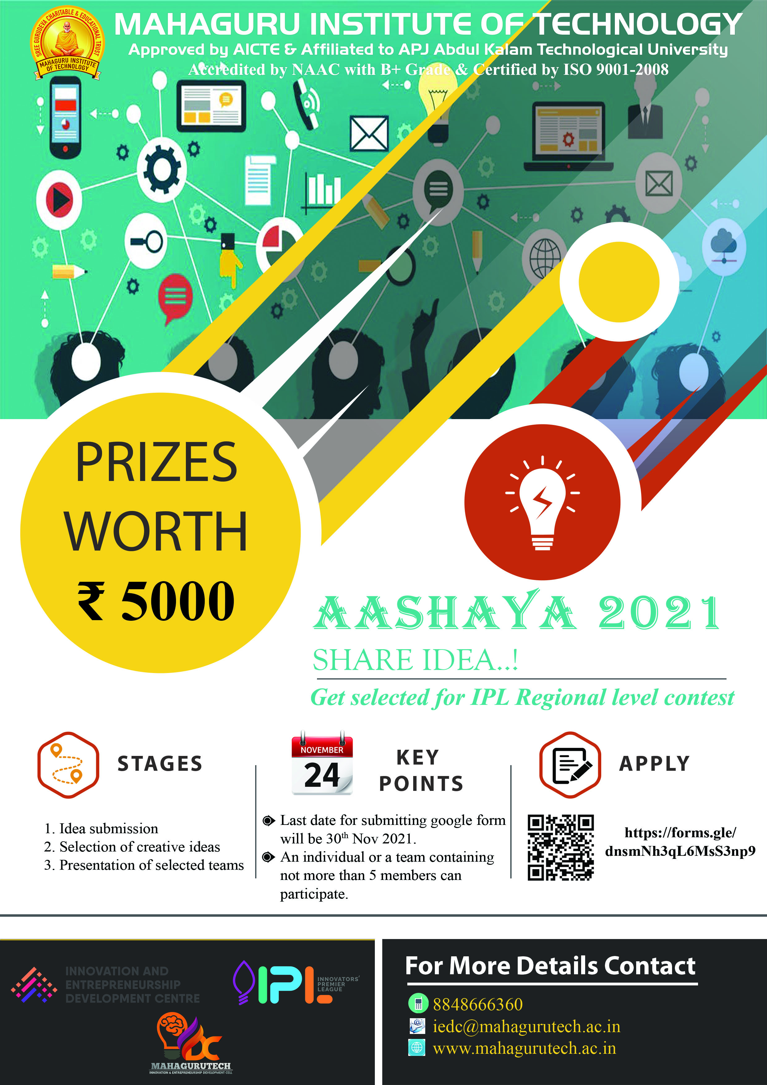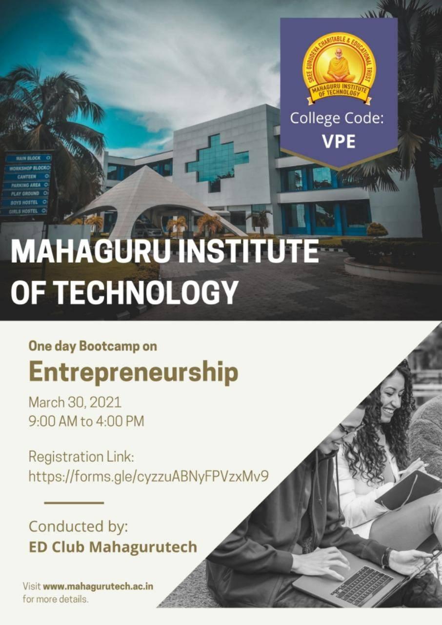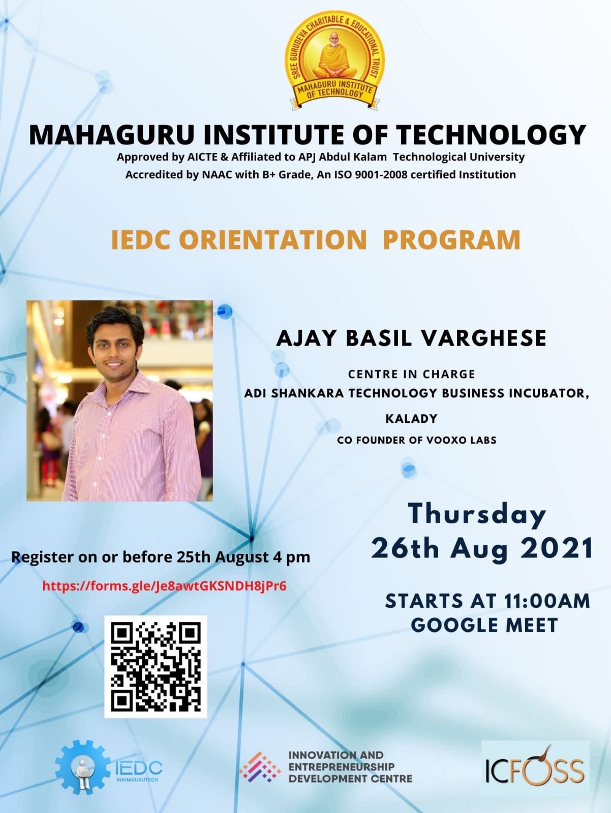 The Innovation & Entrepreneurship Development Club (IEDC) of Mahagurutech started its activities actively from 2016. “Our aim is to mould the young student entrepreneurs with innovative ideas of social relevance & thereby introducing a culture of entrepreneurship inside the campus which will strengthen our education system & thereby promotes national economic & social growth”. Every year we are organizing seminars, bootcamps, workshops & classes by experts from various fields to create entrepreneurial culture among students. Idea pitching and hackthons are also conducted with do-it-learn-it methodology & interaction with experts. Social relevant and innovative projects as well as prototyping are achieved by gaining expert advices. Many Product developments and Startup initiatives are achieved by the support of IEDC Mahagurutech. Our students have won lot of prizes from various programs like IEDC summit, hackthons, techfests etc. Every year there'll be industrial visits to provide an exposure to students about practical working environment. Thereby IEDC Mahagurutech continues its wonderful journey with GROWTH, IMPROVEMENT & SUCCESS.